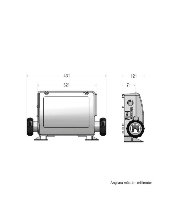 Stöd för cirkulationspump, Pump 1, Pump 2 och Pump3 eller blower. Anslutningar finns för ozon, UV-C eller AOP, belysning (10V/2 A), stereo (230V/2 A) och WiFi-modul (Control My Spa). Värmaren är på 3 kW och kan kopplas till 1-fas eller 3-fas.