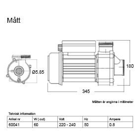 Cirkulationspump från Balboa levereras med en 1,3 meter lång anslutningskabel utrustad med 4-polig AMP-kontakt för enkel installation. Pumpen drivs med 230 V, förbrukar 0,8 A vid 50 Hz och har en effekt på 60 W.