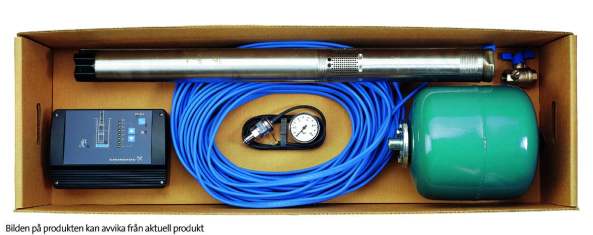 Grundfos SQE2-55 borrhålspaket har en enfas djupvattenpump för 200–240 V med inbyggd, steglös varvtalsreglering som anpassar driften efter behov. Pumpen har en motoreffekt på 0,7 kW, är IP68-klassad och tillverkad i rostfritt stål (AISI 304), vilket gör den lämpad för kontinuerlig drift i borrhål med en minsta diameter på 76 mm. Den levererar upp till 2,1 m³/h vid ett maximalt arbetstryck på 15 bar och är utrustad med invändig G 1 1/4″-anslutning samt integrerad backventil. Pumpen levereras komplett med konstanttrycksregleringspaket och 40 meter kabel och är avsedd för medietemperaturer mellan 0 och 35°C.