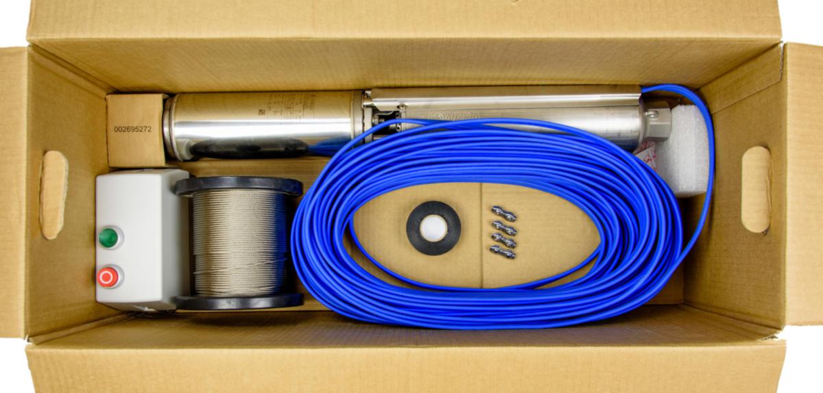 Lowara Borrhålspump 2GS 3-fas Pumppaket innehåller en Lowara 4″ pump med motor, 60 meter alternativt 140 meter kabel ansluten till motorn via kontakt, 65 meter rostfri vajer på 2,3 mm med vajerlås, motorskydd samt 25 meter tejp.